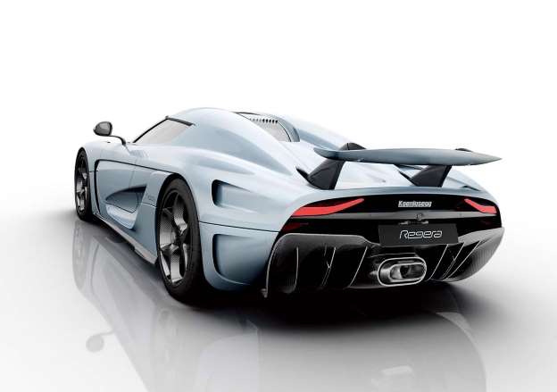 採取混合動力的Regera,中央像排氣管的模組是用以冷卻電池的系統,而排氣管則是位於其左右兩邊的隙縫中。此外可完全折疊的尾翼亦堪稱一絕。